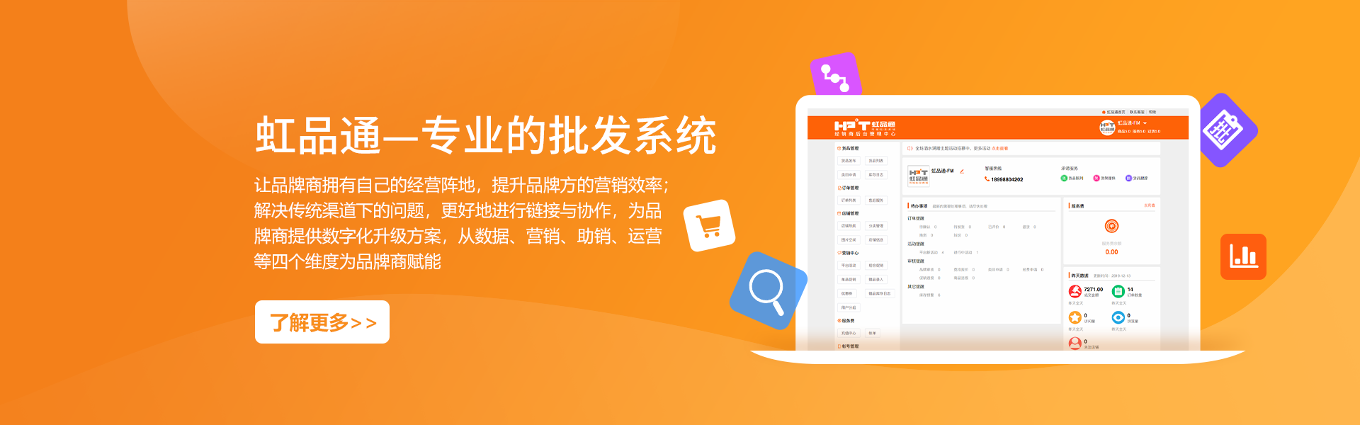 南寧虹品通軟件科技有限公司成立于2014年,是一家開發軟件技術服務公司。公司總部位于中國綠城南寧市,專注軟件行業系統支持和供應鏈大數據開發,并將其應用于商業領域。掌握供應鏈系統研發、商品流通大數據、批發零售商城等核心技術,并持有多項技術專利和著作權。公司致力于幫助生產廠家、商品流通、銷售型企業向互聯網化轉型升級,利用互聯網獲取客戶、洞察市場、服務客戶